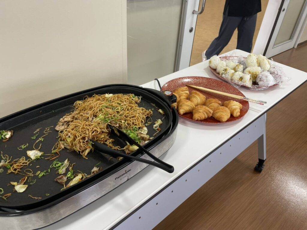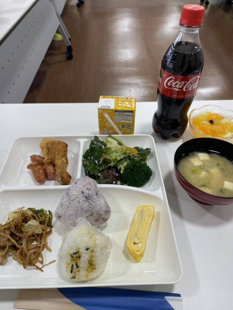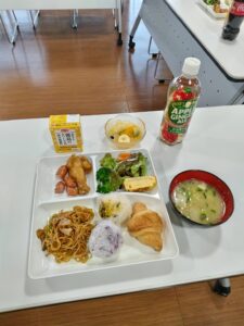 焼きそば、おにぎり、バン、唐揚げ、野菜サラダ、ウインナー、フルーツボンチ、キュウイ、バナナ、ミカンなど美味しく出来ました❗️