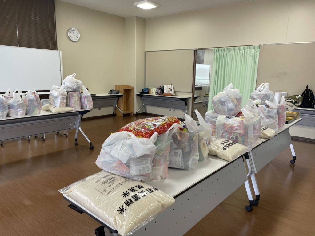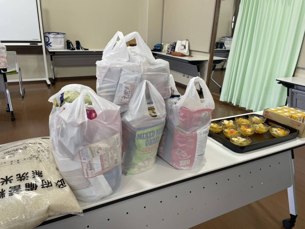 持ち帰り食材(お米10キロ、麺類、缶詰、調味料、お菓子など)配布しました。